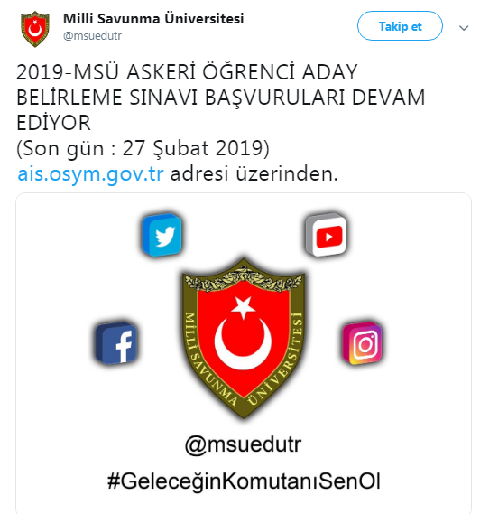 Milli Savunma Üniversitesi tarafından bugün yapılan uyarıda başvuruların 27 Şubat günü sona ereceğine yer verildi.