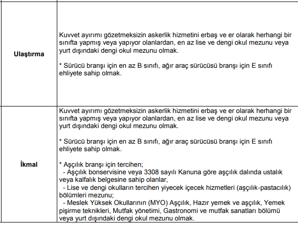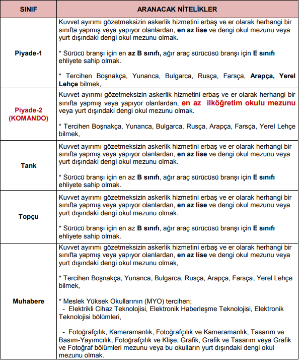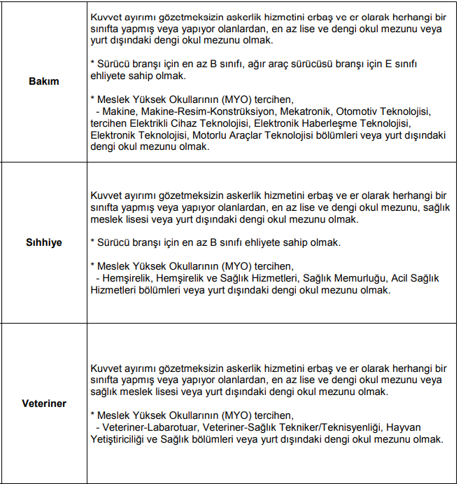 - Uzman onbaşı adayları için ilköğretim/ortaokul veya yurt dışındaki dengi okul mezunu olmak (öğrenimini yurt dışında bitirenlerin diplomalarının denkliği onaylanmış olmak),
