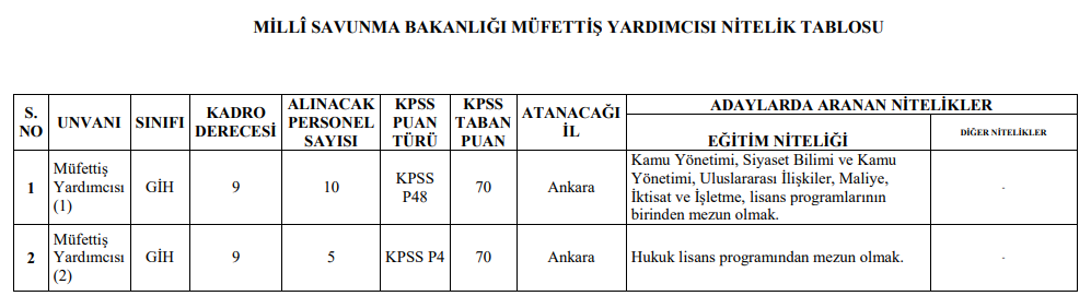 Milli Savunma Bakanlığı müfettiş yardımcılığı için personel alımı yapacağını duyurdu. Toplamda 15 personel alımı yapacak Bakanlık, alınacak personelleri Merkez teşkilatı Ankara’da istihdam edecek.