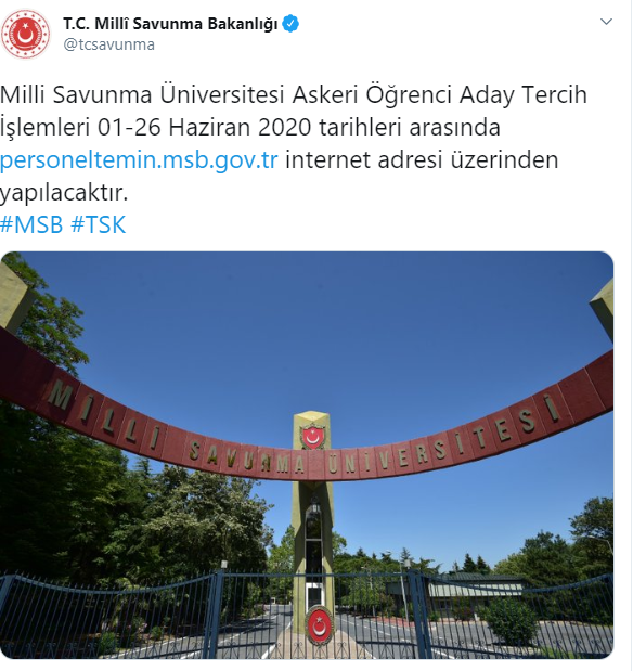 MSB resmi açıklamasında, "Milli Savunma Üniversitesi Askeri Öğrenci Aday Tercih İşlemleri 01-26 Haziran 2020 tarihleri arasında https://personeltemin.msb.gov.tr internet adresi üzerinden yapılacaktır." ifadeleri görüldü.
