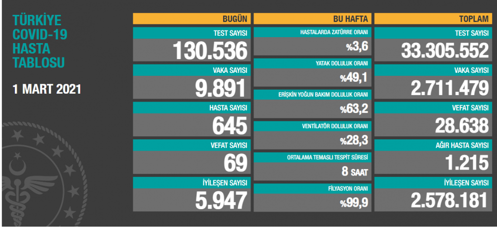 Son dakika haberi: 1 Mart 2021 tarihinin koronavirüs tablosu az önce yayımlandı. Vaka sayısı 1 bin sınırına yaklaşıyor.