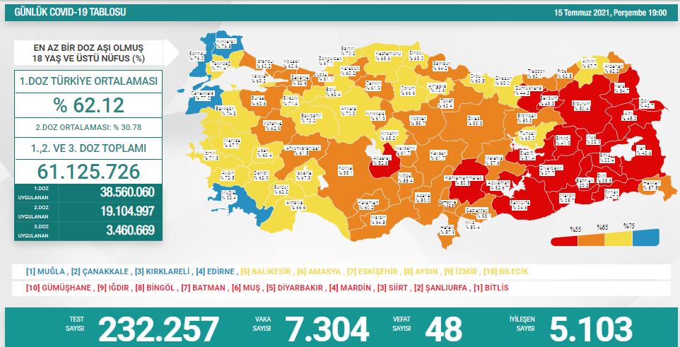 15 Temmuz Koronavirüs Tablosu Yayımlandı