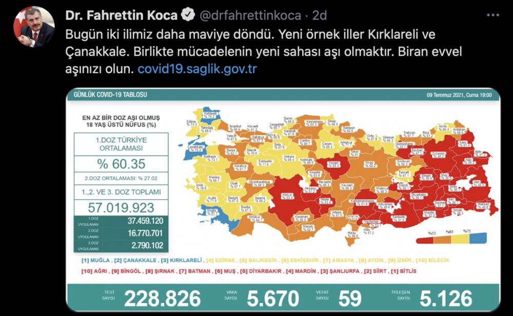 9 Temmuz Koronavirüs tablosu yayımlandı.