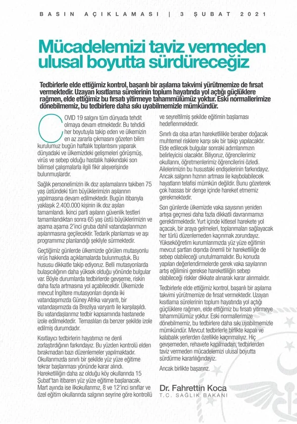 Koronavirüs Bilim Kurulu toplantısının ardından Sağlık Bakanı Fahrettin Koca, yazılı açıklama yayımladı.