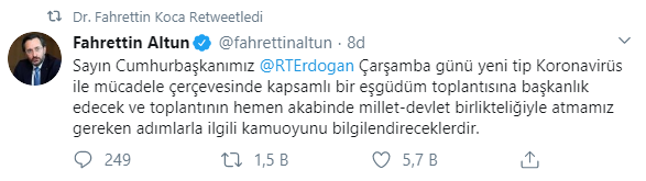 Altun paylaşımında, "Sayın Cumhurbaşkanımız @RTErdogan Çarşamba günü yeni tip Koronavirüs ile mücadele çerçevesinde kapsamlı bir eşgüdüm toplantısına başkanlık edecek ve toplantının hemen akabinde millet-devlet birlikteliğiyle atmamız gereken adımlarla ilgili kamuoyunu bilgilendireceklerdir." dedi.