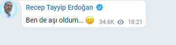 Cumhurbaşkanı Recep Tayyip Erdoğan, Ankara Şehir Hastanesi'nde Çin merkezli Sinovac firması tarafından geliştirilen Coronavac aşısını yaptırdı.
