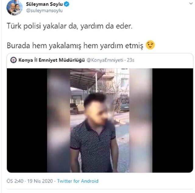 Polise yakalanmadan başlığı ile sosyal medya hesabından görüntüler paylaşan şahıs, "Günlerdir çalışmıyor. Ekmek alma bahanesiyle kendimi tedavi edeceğim. Sizi de" ifadelerini kullanmış daha sonra aracıyla sokaklarda tehlikeli hareketler yapmıştı. Kısa sürede polis ekipleri tarafından yakalanarak gözaltına alınan şahsın "pişmanım" dediği görüntüleri paylaşan İçişleri Bakanı Soylu, "Türk polisi yakalar da, yardım da eder. Burada hem yakalamış hem yardım etmiş" ifadelerini kullandı.