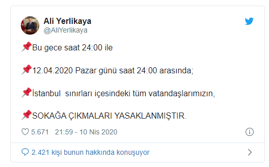 Vali Yerlikaya, "Bu gece saat 24:00 ile 12.04.2020 Pazar günü saat 24:00 arasında; İstanbul sınırları içesindeki tüm vatandaşlarımızın sokağa çıkmaları yasaklanmıştır" ifadelerini kullandı.