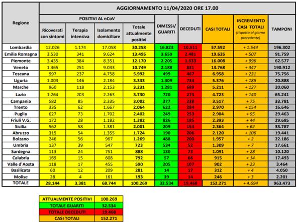 İtalya'da, salgın koronavirüsüne başından bu yana, en az 152.271 kişi virüsü SARS-CoV-2 den fazla yer (4694 dün% 3.2 büyüme için) . Bunlardan 19.468 (+619 +% 3.3) öldü ve 32.534 (+2.079 +% 6.8) taburcu edildi. Şu anda kesinliği olan olumlu konular 100.269 (+1.396, +% 1.4; sayı yukarıda belirtildiği gibi 152.271'e yükseliyor - hesaplamada ölü ve tedavi de varsa, yani salgından bu yana virüs için pozitif bulundu). Veriler Sivil Koruma tarafından sağlanmıştır.