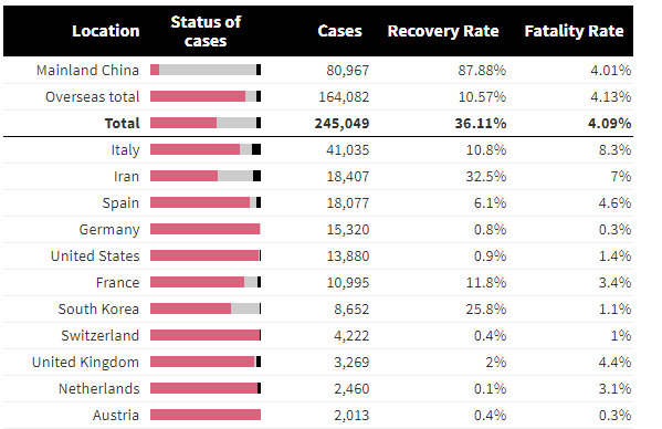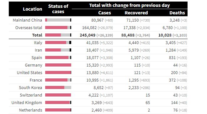 Çin anakarasında yerel kaynaklı koronavirüs vakalarının durma noktasına gelmesinden kısa süre sonra ölümlü vaka olarak Çin'i de geçen İtalya'da işler günden güne kötüye gidiyor. Dünya genelinde toplam 10 bin 28 kişi koronavirüs nedeniyle hayatını kaybederken, 88 bin kişi koronavirüsü atlatarak taburcu edildi. Gözetim altında tutulan kişi sayısı 146 bin 533.