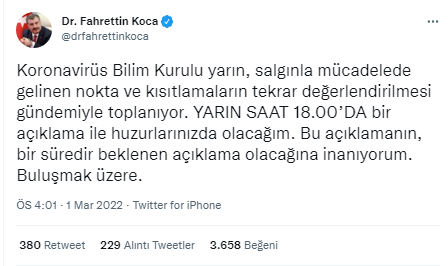 "Koronavirüs Bilim Kurulu yarın, salgınla mücadelede gelinen nokta ve kısıtlamaların tekrar değerlendirilmesi gündemiyle toplanıyor. Yarın saat 18.00'de bir açıklama ile huzurlarınızda olacağım. Bu açıklamanın, bir süredir beklenen açıklama olacağına inanıyorum. Buluşmak üzere."