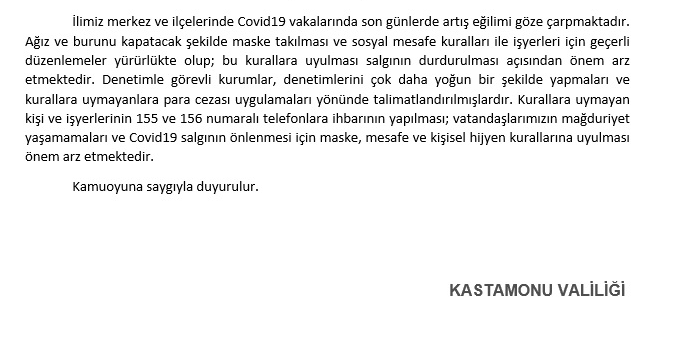 Kastamonu Valiliği , İl genelindeki koronavirüs vaka sayısındaki artışa ilişkin açıklama yayımladı. İl merkezi ve ilçelerdeki koronavirüs vakalarında son günlerde artış görüldüğüne yer verilen Valilik açıklamasında, ağız ve burunun kapatılacak şekilde maske takılması, sosyal mesafeye uyulması ve iş yerleri için geçerli düzenlemelerin hala yürürlükte olduğuna ve vatandaşların bu kurallara uyması gerektiğine vurgu yapıldı. Kurallara uymayan kişi ve iş yerlerinin 155 ve 156 numaralı telefonlara ihbar edilmesi çağrısının yer aldığı açıklamada, denetimle görevli kurumların denetimleri arttırması ve kurallara uymayanlara para cezası uygulaması yönünde talimatlandırıldığı da kaydedildi.