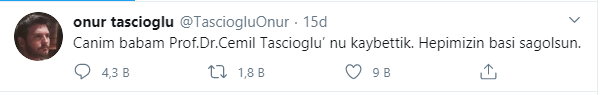 Onur Taşçıoğlu, "Canim babam Prof.Dr.Cemil Tascioglu’nu kaybettik. Hepimizin basi sagolsun." ifadelerini kullandı.