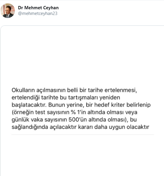 Okulların açılış tarihinin ertelenmesi durumunda tartışmaların okulların erteleneceği tarih itibariyle yeniden başlayacağına vurgu yapan Prof. Dr. Ceyhan, erteleme kararı yerine, hedef kriter belirlenmesi ve test vaka sayısı durumuna göre bölgelere göre kararlar alınmasının daha doğru olacağını belirtti. Enfeksiyon Hastalıkları Derneği Başkanı Prof. Dr. Ceyhan, "Okulların açılmasının belli bir tarihe ertelenmesi, ertelendiği tarihte bu tartışmaları yeniden başlatacaktır. Bunun yerine, bir hedef kriter belirlenip (örneğin test sayısının %1'in altında olması veya günlük vaka sayısının 500'ün altında olması) , bu sağlandığında açılacaktır kararı daha uygun olacaktır." ifadelerini kullandı.