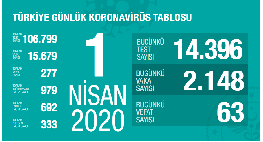 Son 24 saatte yapılan test sayısı 14 bin 396, bugünkü vaka sayısı 2148, bugün hayatını kaybedenlerin sayısı 63, toplam ölü sayısı 277.