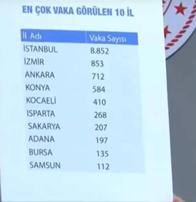 BUGÜNE KADAR İLLERİN DAĞILIMINI GÖSTERMEMİŞTİK AMA GÖSTERİYORUZ. 1 İLİMİZDE ŞİMDİYE KADAR GÖRÜLMEMİŞTİ, TÜM İLLERİMİZDE ARTIK BU VİRÜSÜN OLDUĞUNU BİLİYORUZ. BURADA GÖRÜLEN ÖN PLANDA DAHA ÇOK VAKANIN İSTANBUL'DAKİ GÖRÜLEN VAKA SAYISI 8 BİN 852, %60'LARA YAKIN. ONU İZMİR İZLİYOR 813, ANKARA'DA 712, KONYA'DA 584, 410 VAKA KOCAELİ'DE GÖRÜLDÜ.
