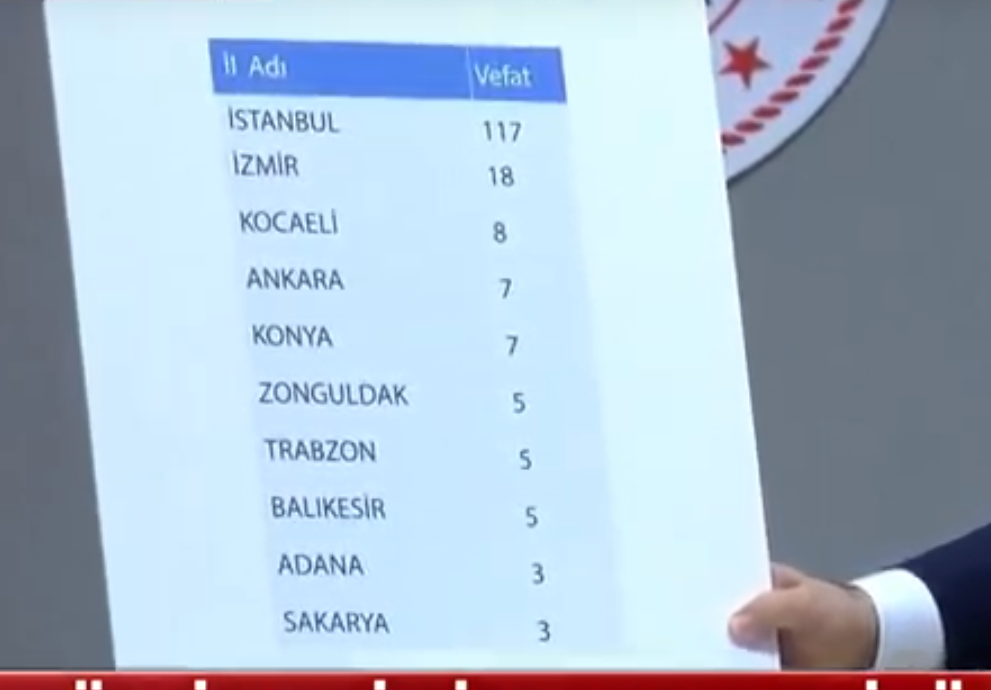 "Toplam 39 İlimizde Can kaybımız var" diyen Koca şunları söyledi: 42 ilimizde hayatını kaybeden vatandaşımızın olmadığını gösterir bir tablo. İstanbul, İzmir, Kocaeli, Ankara, Konya, Zonguldak, Trabzon, Balıkesir, Adana, Sakarya şeklinde ilk 10 ilimizin sıralaması da bu şekilde.