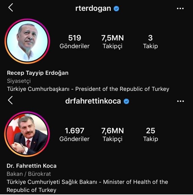 Sağlık Bakanı Fahrettin Koca, instagram hesabı takipçi sayısında Cumhurbaşkanı Recep Tayyip Erdoğan'ı da geçerek 7.6 milyon takipçi sayısına yükseldi.