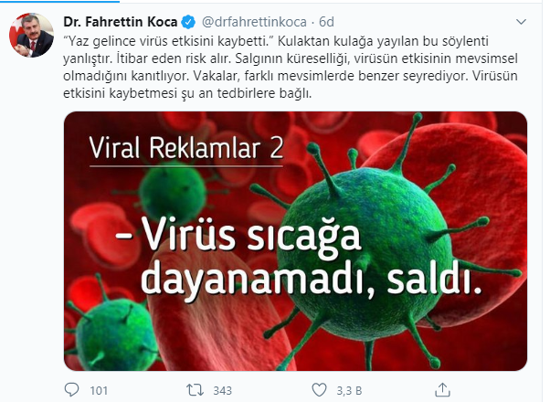 Sağlık Bakanı Fahrettin Koca , yaz aylarına girilmesiyle birlikte yeni tip koronavirüsün etkisini yitirdiğine yönelik iddiaların gerçekleri yansıtmadığını, ilgili söylentilere itibar edenlerin risk alacağını söyledi.