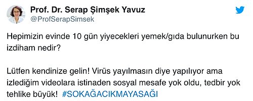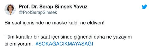Bilim Kurulu'nun bir diğer üyesi Prof. Dr. Serap Şimşek Yavuz da sokağa çıkma yasağı sonrası cadde ve sokaklarda oluşan izdiham görüntülerine tepkiliydi. Yavuz, Twitter hesabından yaptığı paylaşımda şunları kaydetti: