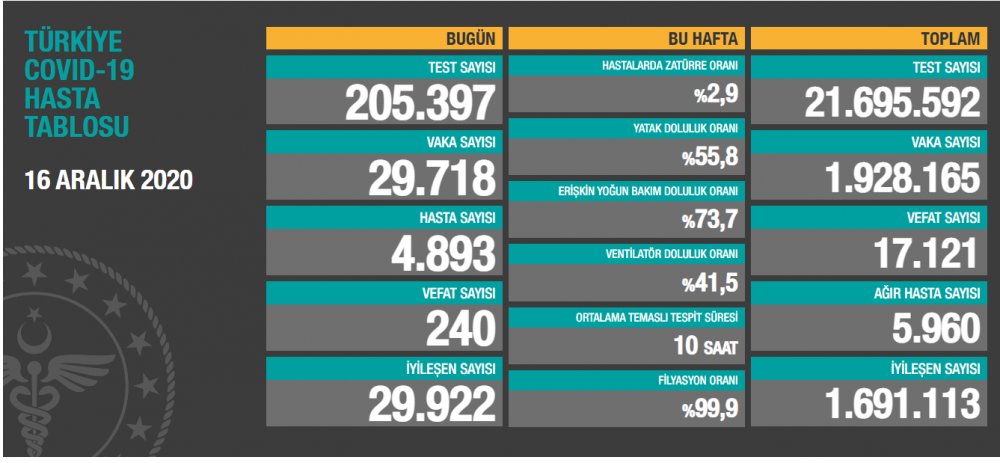 Sağlık Bakanlığı covid 19 sayfası üzerinden bir son dakika açıklaması geldi. Yapılan açıklamada 16 Aralık 2020 tarihine ait koronavirüs tablosuna yer verildi. Yayımlanan korona tablosuna baktığımızda günlük vaka ,vefat ve iyileşen hasta sayısına yer verildi.