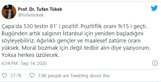 "Çapa'da 530 testin 81' i pozitif. Pozitiflik oranı %15 i geçti. Bugünden artık salgının İstanbul için yeniden başladığını söyleyebiliriz. Ağırlıklı gençler ve maalesef zatürre oranı yüksek. Moral bozmak için değil tedbir alın diye yazıyorum. Yoksa herkes üzülecek"