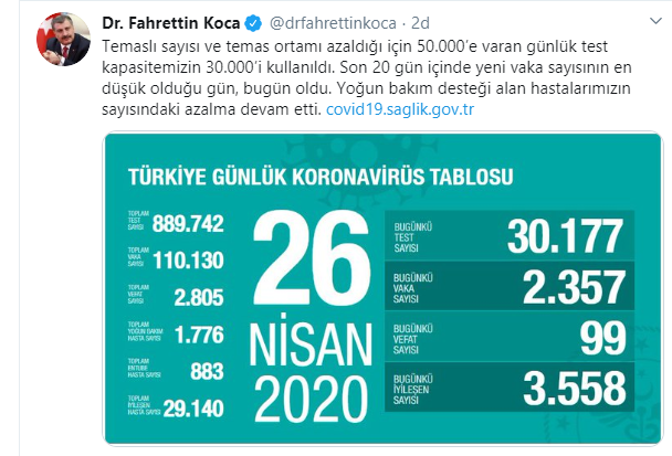 Sağlık Bakanı Fahrettin Koca, yeni tip koronavirüsle ilgili son verileri sosyal medya hesabından bugün paylaştı. Açıklanan son veriler doğrultusunda Türkiye'de salgının durağan seviyeye geldiği ve düşüşe geçmeye başladığı görülürken, vaka sayısı 20 günün en düşük seviyesine gelmiş durumda. Bilim Kurulu üyeleri ve Sağlık Bakanı Fahrettin Koca, tabloya rağmen tedbirleri elden bırakmamak, bu seviyeye tedbirler sayesinde gelindiğini unutmamak konusunda uyarılarını sürdürüyor. Bakan Koca, mübarek Ramazan ayı vesilesiyle kalabalık iftar sofralarındaki bulaş riskine dikkat çekerek sosyal medya hesabından çorba fotoğrafı paylaşarak, "Biri tuz yerine Koronavirüs uzatabilir. Kalabalık iftarları gelecek yıl yapalım. Hayırlı iftarlar." ifadelerini kullanmıştı.