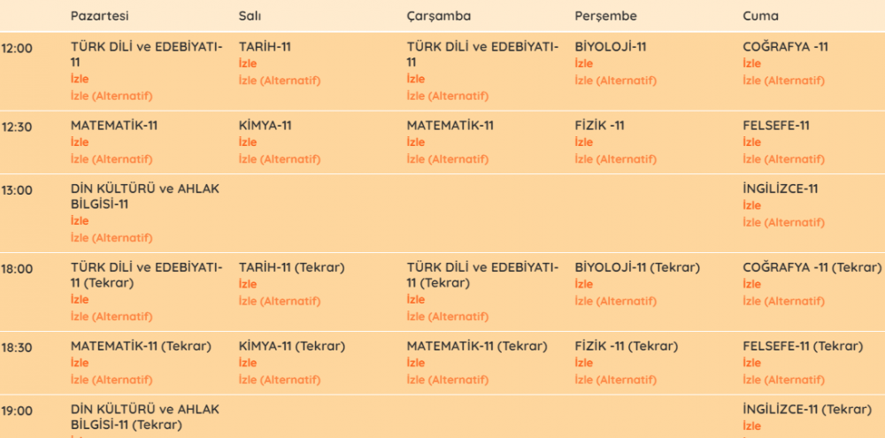 11. SINIF EBA TV HAFTALIK DERS PROGRAMI SAATLERİ