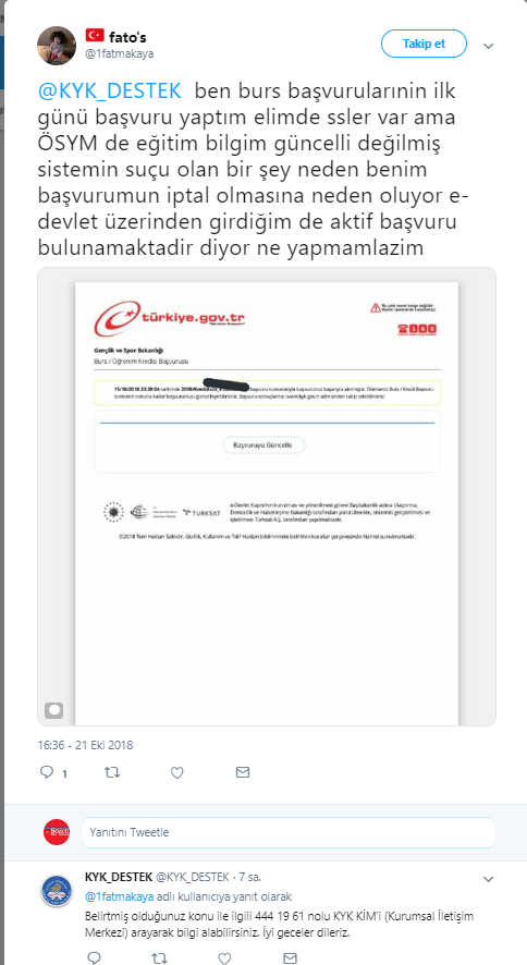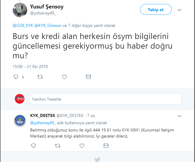 Bazı paylaşımlara cevap veren KYK Destek adlı Twitter hesabı hepsine aynı şekilde cevap vermeye başladı. KYK Destek Twitter hesabı, “Belirtmiş olduğunuz konu ile ilgili 444 19 61 nolu KYK KİM'i (Kurumsal İletişim Merkezi) arayarak bilgi alabilirsiniz. İyi geceler dileriz.” mesajı ile cevap verdi. Konu ile ilgili henüz bir resmi açıklama yapılmış değil.