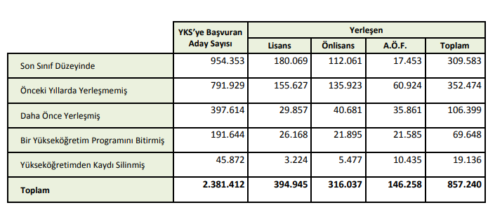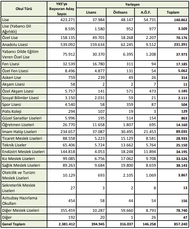 Yayımlanan sayısal verilere göre 1 milyon 69 bin 953 kişi lise düzeyinden, 679 bin 191 kişi de meslek lisesi düzeyinden YKS sonucuna göre tercih yapma hakkına sahip oldu. Lise düzeyinden 715 bin 58 kişi tercih yaparken meslek lisesi düzeyinden 491 bin 753 kişi tercih bildirimi yaptı. Toplamda 1 milyon 206 bin 811 kişi üniversitelere yerleşmek için ÖSYM 'ye tercih bildirimi yaptı.