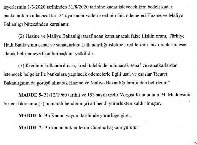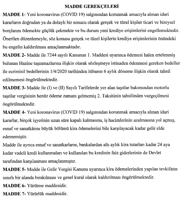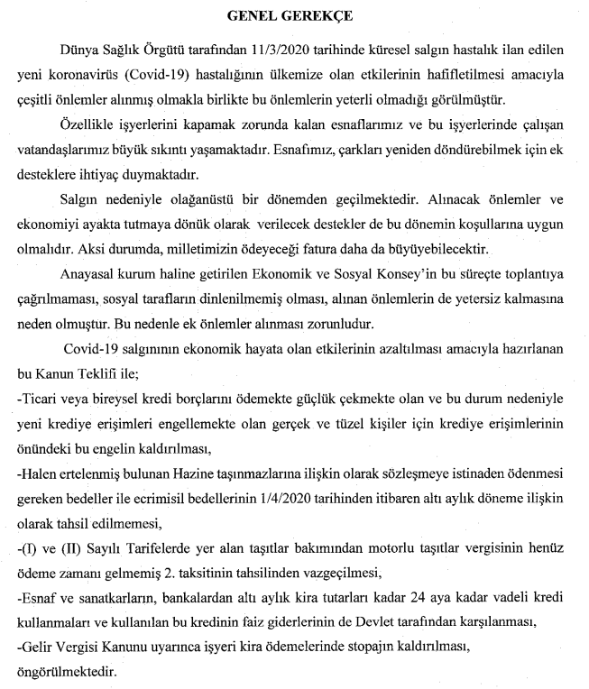 "Teklif ile; borçlarını ödemekte güçlük çeken gerçek ve tüzel kişilerin, Türkiye Bankalar Birliği Risk Merkezi nezdinde tutulan kayıtlar engel olmaksızın yeni kredi çekebilmeleri; ertelenmiş bulunan Hazine taşınmazlarına ilişkin olarak sözleşmeye istinaden ödenmesi gereken bedeller ile ecrimisil bedellerinin 1/4/2020 tarihinden itibaren altı aylık döneme ilişkin olarak tahsil edilmemesi; motorlu taşıtlar vergisinin henüz ödeme zamanı gelmemiş 2 nci taksidinin tahsilinden vazgeçilmesi; esnaf ve sanatkarların, bankalardan 6 aylık kira tutarları kadar 24 aya kadar vadeli kredi kullanmaları ve kullanılan bu kredinin faiz giderlerinin Devlet tarafından karşılanması; işyeri kira ödemelerindeki stopajın kaldırılması amaçlanmaktadır."