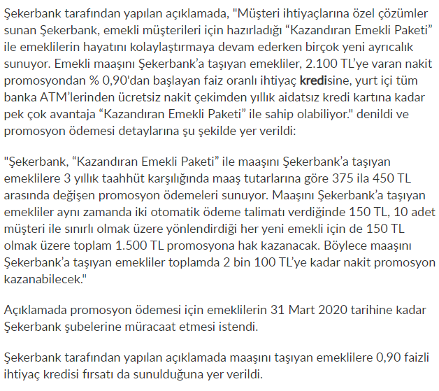 Emeklileri ilgilendiren açıklamada, banka promosyonu için kamu bankalarının tekliflerinin beklenmesi gerektiği bildirildi. Kamu bankalarının teklifleri sornası özel bankaların rakamları yükseltebileceği bildirildi. İş Bankası, Halk Bankası ve Vakıfbank henüz 2020 promosyon tekliflerini açıklamadı.