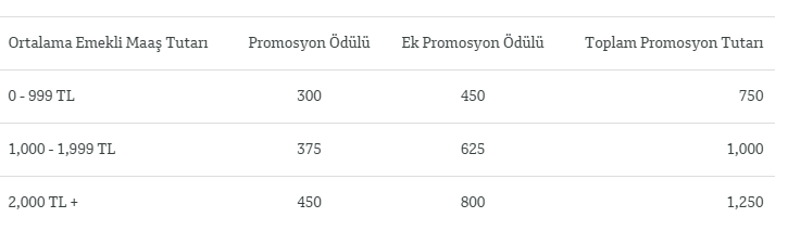 Kampanyadan yararlanmak için emekli maaşınızı 3 yıl boyunca bankamızdan almalı ve herhangi bir bankacılık ürünümüzü kullanmalısınız. Ek promosyon ödemeleri detaylarıda aşağıda yer almaktadır.