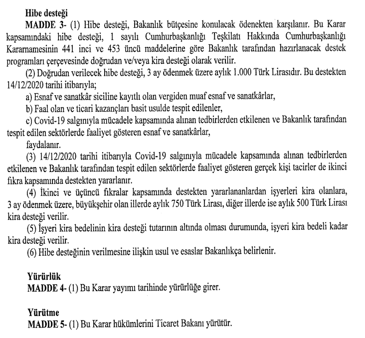 23 Aralık 2020 tarihli Resmi Gazete sayısında bir karar yayımlandı. Bugün yayımlanan Cumhurbaşkanlığı Kararında esnaflara yapılacak 1000 TL'lik hibe desteğinin detaylarına yer verildi. 3 ayda her ay 1000 lira şeklinde verilecek hibe desteğine ilişkin detaylar şu şekilde: