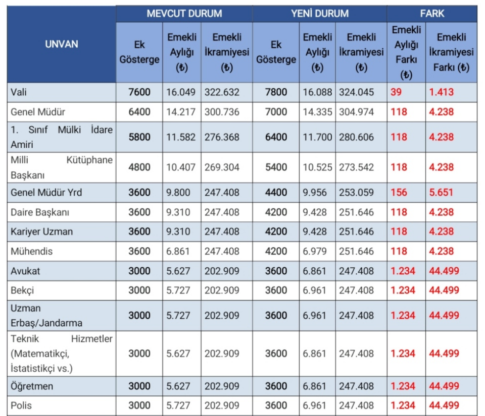 Düzenleme kapsamında ek göstergesi 3600’e çıkan ve 30 yıllık hizmeti olan bir memurun; emekli aylığında 1234 TL ile 1391 TL, emekli ikramiyesinde ise 44.500 TL ile 50.150 TL arasında bir artış olacak. Birinci dereceye gelmiş 3000 ek göstergeli öğretmenin, sağlık çalışanının ve din görevlisinin emekli aylığı 5627 TL’den 6861 TL’ye çıkacak, emekli ikramiyesi ise 202.909 TL’den 247.408 TL’ye çıkacak. Böylece söz konusu kamu görevlilerinin emekli aylıklarında ve ikramiyelerinde yüzde 22 oranında artış sağlanacak. Polisler de yüzde 22’lik artıştan yararlanacak ve emekli aylıkları 5727 TL’den 6961 TL’ye, emekli ikramiyeleri ise 202.909 TL’den 247.408 TL’ye yükselecek. 2200 ek göstergeli 4 yıllık yükseköğrenim mezunu hemşire ve din görevlileri ise yüzde 25’lik bir artışla emekli aylıklarında 1391 TL ve ikramiyelerinde 50.150 TL ilave ödeme alacak.