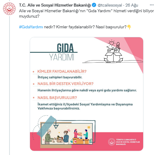 İhtiyaç sahibi ailelere yönelik başlatılan gıda yardımı ile ilgili Aile ve Sosyal Hizmetler Bakanlığı tarafından bir açıklama yapıldı. Sosyal medya hesabından yapılan açıklamada, ‘’ Aile ve Sosyal Hizmetler Bakanlığı’nın "Gıda Yardımı" hizmeti verdiğini biliyor muydunuz?’’ başlığı kullanıldı. Yapılan bu açıklamada kimlerin bu kapsamda başvuru yapabileceği ve başvuru için hangi şartların gerektiği belirtildi.