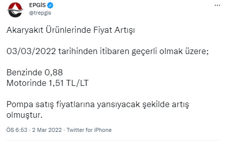 Pompa satış fiyatlarına yansıyacak şekilde artış olmuştur.’’