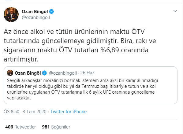 Vergi Uzmanı Ozan Bingöl bir son dakika açıklamasında bulundu. Twitter adresi üzerinden açıklama yapan Bingöl, daha önce yaptığı "Sevgili arkadaşlar moralinizi bozmak istemem ama aksi bir karar alınmadığı takdirde her yıl olduğu gibi bu yıl da Temmuz başı itibariyle tütün ve alkol ürünlerine uygulanan ÖTV tutarlarına ilk 6 aylık ÜFE oranında güncelleme yapılacaktır." açıklamasını alıntılayarak şu ifadeleri kullandı: