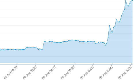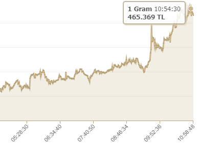 Altın piyasasında da sabah saatlerinden bu yana yükseliş görüldü. Geçen hafta 460 TL seviyesinde olan ve güne de bu seviyeden başlayan gram altın, dolar ve ons fiyatında yaşanan yükselişle birlikte 5 TL değer kazandı ve 465 TL seviyesine kadar tırmandı. İşte gram altında yaşanan yükselişin grafiği: