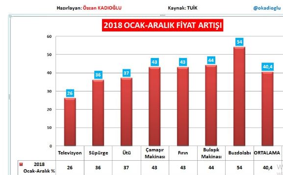 Dünya Gazetesi yazarı Özcan Kadıoğlu tarafından TÜİK verilerince hazırladığı grafiğe göre 2018 yılında en yüksek fiyat artışı yüzde 54 oranıyla buzdolabında yaşanırken, bulaşık makinası fiyatları yüzde 44 oranında, çamaşır makinası ve fırın fiyatlarında yüzde 43 artış görüldü.