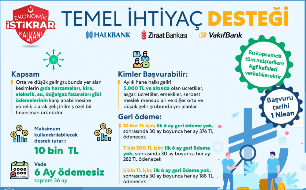 Ziraat , Halk ve Vakıfbank tarafından bir son dakika açıklaması yapıldı. Yapılan açıklamada Temel İhtiyaç Desteği için kredi başvurularının 1 Nisan 2020 günü başlayacağına yer verildi.