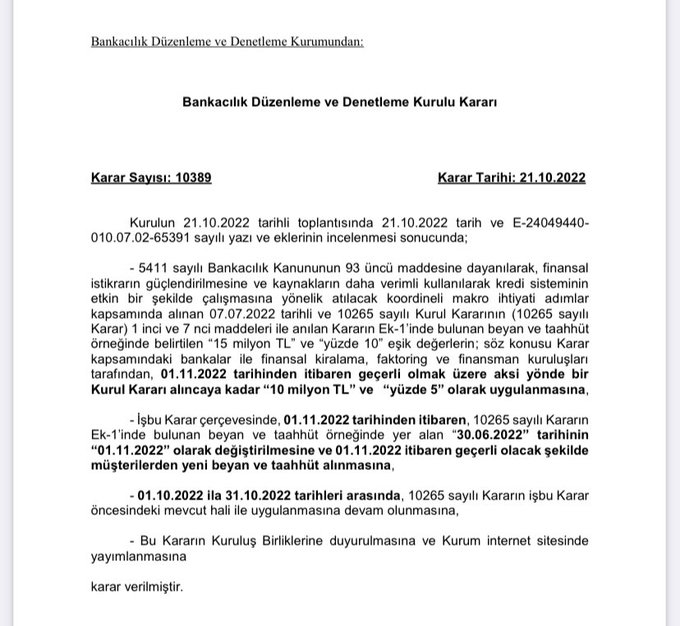 Yeni düzenleme 1 Kasım 2022 tarihi itibariyle geçerli olacak ve yeni bir karar alınana kadar bu durum geçerli olacak.