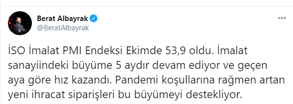 Hazine ve Maliye Bakanı Berat Albayrak bir son dakika açıklamasında bulundu. Bakan Albayrak açıklamasında Ekim ayı imalat sanayi verilerine değindi ve büyümenin 5 aydır devam ettiğini söyledi. Türkiye İstatistik Kurumu tarafından yapılan açıklamada , "Türkiye’de ekim imalat sanayi PMI 53,9 (Önceki: 52,8)" denilmişti.