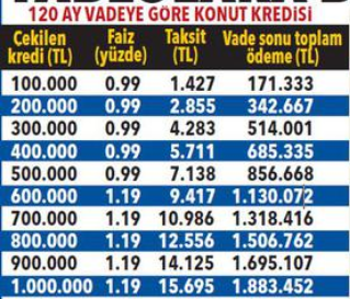 İşte kamu bankalarının 120 ay vade ile vatandaşlara verdiği konut kredisinin geri ödemesi.