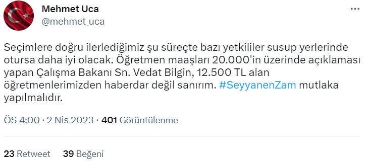 Seçimlere doğru ilerlediğimiz şu süreçte bazı yetkililer susup yerlerinde otursa daha iyi olacak. Öğretmen maaşları 20.000'in üzerinde açıklaması yapan Çalışma Bakanı Sn. Vedat Bilgin, 12.500 TL alan öğretmenlerimizden haberdar değil sanırım. #SeyyanenZam mutlaka yapılmalıdır.''