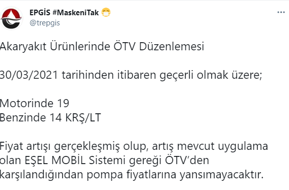 EPGİS'ten yapılan açıklamada, "Akaryakıt Ürünlerinde ÖTV Düzenlemesi 30/03/2021 tarihinden itibaren geçerli olmak üzere; Motorinde 19 Benzinde 14 KRŞ/LT Fiyat artışı gerçekleşmiş olup, artış mevcut uygulama olan EŞEL MOBİL Sistemi gereği ÖTV’den karşılandığından pompa fiyatlarına yansımayacaktır." denildi.