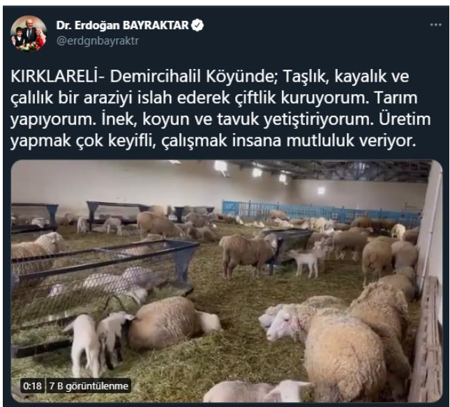 Sosyal medya hesabıdnan çiftliğinden görüntüleri paylaşan Bayraktar, "KIRKLARELİ- Demircihalil Köyünde; Taşlık, kayalık ve çalılık bir araziyi islah ederek çiftlik kuruyorum. Tarım yapıyorum. İnek, koyun ve tavuk yetiştiriyorum. Üretim yapmak çok keyifli, çalışmak insana mutluluk veriyor." ifadelerini kullandı.