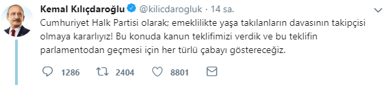 Kemal Kılıçdaroğlu 'ndan emeklilikte yaşa takılanlarla ilgili son dakika açıklaması geldi. Kılıçdaroğlu yaptığı açıklamada, " Bu konuda kanun teklifimizi verdik ve bu teklifin parlamentodan geçmesi için her türlü çabayı göstereceğiz." ifadelerini kullandı.