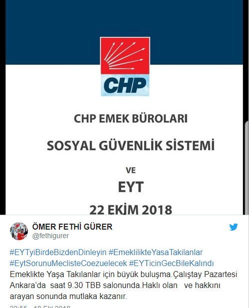 Tartışmalar devam ederken EYT konusunda yeni bir adım da Cumhuriyet Halk Partisi 'nden geldi. CHP Niğde Milletvekili Ömer Fethi Gürer yaptığı son dakika açıklmasında 22 Ekim Pazartesi günü Emeklikte Yaşa Takılanlar için bir çalıştay yapacaklarını duyurdu.