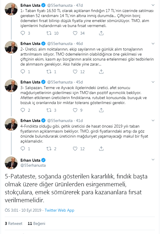 Milletvekili Erhan Usta , fındık fiyatları ile ilgili önemli açıklamada bulundu. Twitter adresi üzerinden paylaşım yapan Usta , borç zamanın gelmesi nedeniyle çiftçilerin zora girdiği, bunu fırsat bilen birçok alıcının da fiyatları düşürdüğünü söyledi.